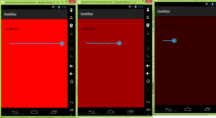 Projenin en önemli kısmı onProgressChanged fonksiyonunun içerisine yazılan 3 satırlık kodlardır. İlk olarak seekbar çubuğumuzun son değerini belirlememiz gerekir. yani çubuk sona geldiğinde taşıdığı değeri bilmesi gerekmektedir. RGB renkleri 0-255 arasında değerler aldığı için setMax değerine 255 değeri verilmiştir. Hemen altında ise bir kod satırı daha bulunmaktadır. Bu satırda ise hangi rengin ekranda belireceği yazılmıştır. RedGreenBlue parametrelerini alan "setBackgroundColor(...);" fonksiyonuna örnek olarak kırmızı rengi seçelim. O halde kodumuzun ilk parametresi "progress" diğer ikisi ise 0 olarak ayarlanmalıdır. "progress" yazılmasında ki amaç seekbardaki değer her bir değişimde bu fonksiyon çağırılması ve progress değeri olarak atanmasıdır.