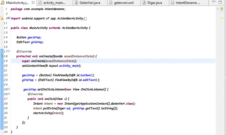 İlk iş olarak her zaman xml file içine eklenen bileşenleri tanıtmak gerekecektir. Hemen ardından eklemiş olduğumuz butona tıklama olayını yazmak gerekecektir. Bu kısımlar daha önceki eğitimlerimizde de belirtildiği gibi hemen hemen her uygulamada yapacağız. O yüzden asıl önemli olan butona tıklama olayının içeriğine yazılan kod parçasıdır. Burada ilk olarak intent ile sayfa geçişi yapılacağı için bir intent nesnesi oluşturulacaktır. Parametre olarak "getAplicationContext(),GelenVeri.class" olarak verilmiştir. Bu parametre şimdiki kodlama yaptığımız sınıftan GelenVeri sınıfına geçiş yap demektir. Hemen altında ise anahtar kodumuz yer almaktadır. Bu satırda veri taşıma işleme yapılmaktadır. Veri taşıma işlemini "putExtra()" fonksiyonu aracılığıyla sağlanmaktadır. Bu fonksiyonun parametrelerine bakıldığı zaman başka bir sınıftan değişken kullanıldığı görülmektedir. Bu sınıfımızın kod kısmı aşağıdaki şekildeki gibidir.
