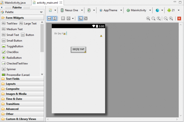 İlk olarak XML içeriğini düzenlemekle başlamak gerekir. XML içeriğine birer adet button, textview ve edittext sürükleyip aşağıdaki şekildeki gibi yerleştirelim.