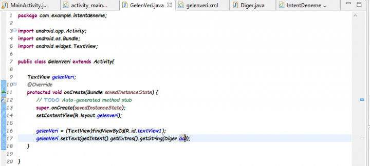 İlk olarak her zamanki gibi eklemiş olduğumuz bileşeni tanımlamak ile koda başlamak gerekebilir. Bir adet textview eklediğimiz için sadece bu textview tanımlanması yapılmaktadır. Gelen veriyi üstünde tutması sağlayan kod parçası 17. satırdadır. Bu satırın anlamı gelen intent verisinin gelen Extras fonksiyonun gelen String değişkenin değerini gelenVeri değişkeninde sakla demektir. Bu satırımızla birlikte artık kodumuz hazır hale gelmiştir. Yalnızca ufak bir ekleme yapmak gerecektir aksi halde projemiz çalışmaz. Bu eklemeyi bir sonraki adımda bulabilirsiniz.
