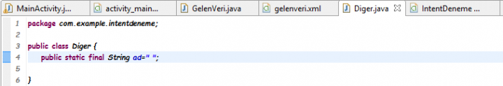 Asıl kodumuza devam edecek olursak ilk parametre olarak Diger.java sınıfından ad değişkeni kullanıldıktan sonra ikinci parametre olarakda bu parametreye yüklenecek olan veriyi eklemektir. Bu veri edittext içine girilen değerdir. Son olarakta "startActivity(intent);" ile intent nesnesini başlatmış oluyoruz. Bu kodlarla beraber MainActivity.java sınıfı kodlaması tamamlanmıştır.